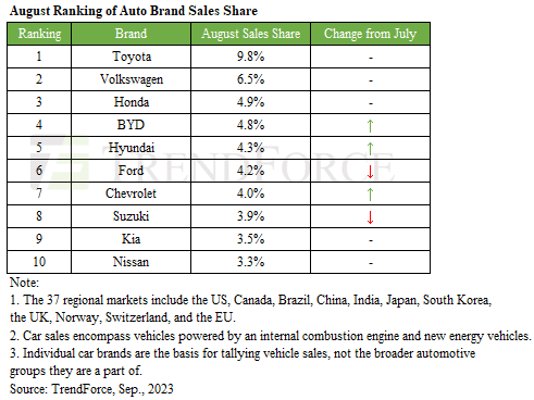 По данным TrendForce, общий объём продаж автомобилей на 37 основных рынках в августе достиг 5,55 млн единиц. На фоне этого динамичного рынка в первую десятку брендов по продажам автомобилей за месяц вошли Toyota, Volkswagen, Honda, BYD, Hyundai, Ford, Chevrolet, Suzuki, Kia и Nissan.
