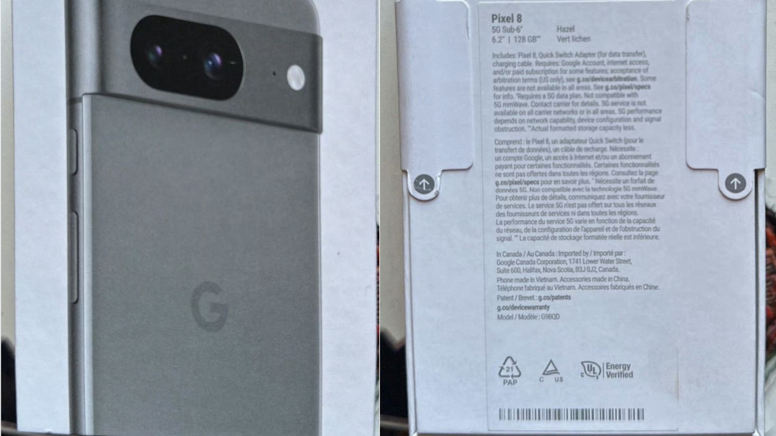 Судя по задней стороне упаковки, Google Pixel 8 будет поддерживать диапазон частот 5G Sub-6GHz. Указана диагональ экрана, которая составляет 6,2 дюйма, а также 128 ГБ флеш-памяти. В комплекте будет адаптер для быстрой зарядки и кабелем для передачи данных.