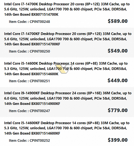 Так, Core i9-14900KF оценен в 779 канадских долларов, и это на 5% больше Core i9-13900KF в том же магазине. Стоимость Core i7-14700K – 589 канадских долларов (плюс 2%), Core i7-14700KF – 549 канадских долларов (плюс 4%), Core i5-14600K – 449 канадских долларов (плюс 7%), Core i5-14600KF – 399 канадских долларов (тут цена вообще не изменилась относительно Core i5-13600KF).