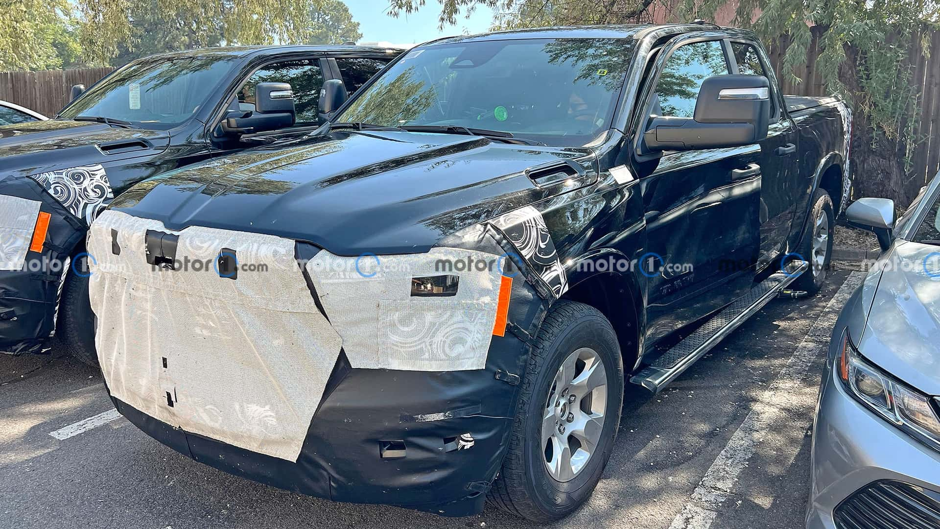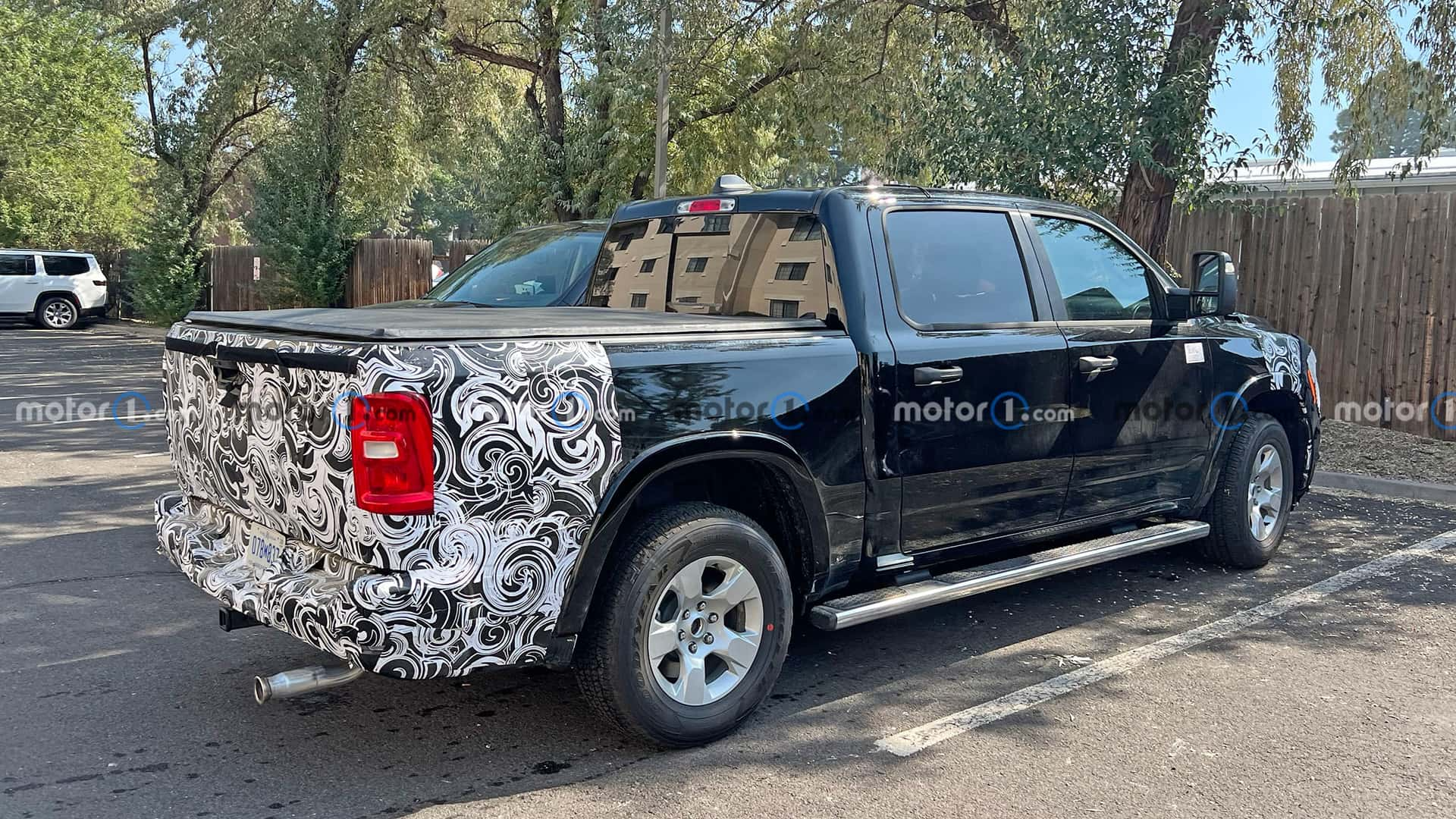За чёрным винилом видны очертания обновлённого бампера. Выше расположены обновлённые фары. Сзади мы видим новый дизайн Ram 1500 и фонари. Выхлопная труба, которая сильно выступает за бампер, вряд ли останется у серийной модели.