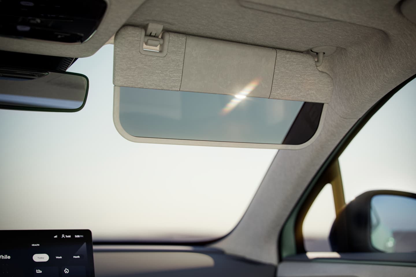 Дизайн внутреннего убранства авто называется «эстетика городского антагонизма». Сложно понять, что этим хотели сказать дизайнеры, но за счет широкого применения тканевой обивки все выглядит очень по-домашнему. Еще одно интересное решение – зеркало во всю длину солнечного козырька. Девушкам такое большое зеркало точно понравится.