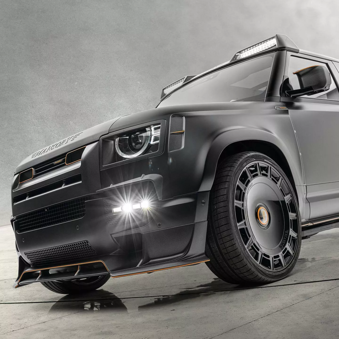 Изменения продолжаются с ярко выраженным сплиттером и парой новых светодиодных противотуманных фар. Mansory также придал обновлённому Defender несколько оранжево-бронзовых акцентов и создал для него лёгкий капот из углеродного волокна с большим логотипом Mansory. Крыша тоже изменена.