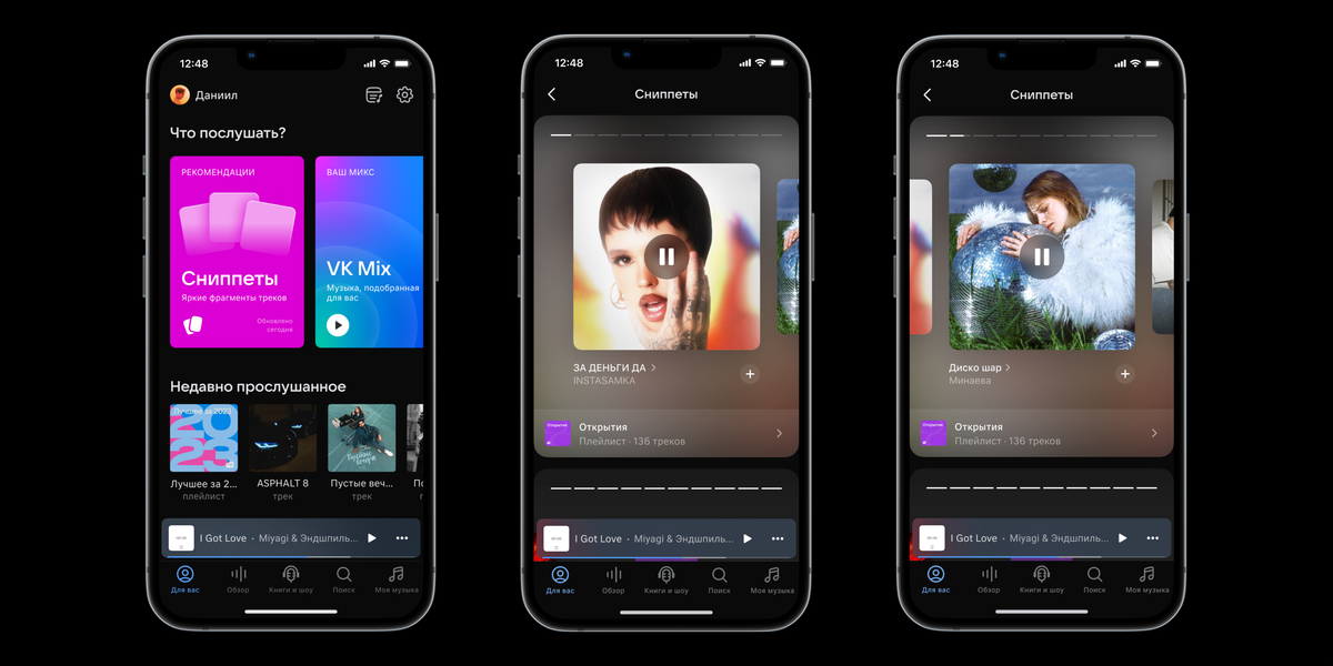 Масштабное обновление появилось на витрине приложения «VK Музыка» и в музыкальном разделе социальной сети «ВКонтакте». В разделе «Сниппеты» можно послушать всю музыку, представленную в сервисе, в коротком формате — от новых релизов и эксклюзивов до множества плейлистов и любимых многими альбомов и треков. Алгоритм рекомендаций подбирает сниппеты на основе музыкальных предпочтений каждого пользователя.
