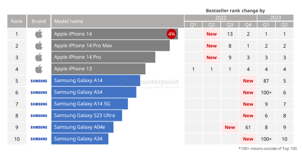 Смартфоны Apple занимает первые четыре места. Самыми продаваемыми в мире стали iPhone 14, iPhone 14 Pro Max, iPhone 14 Pro и iPhone 13. Смартфоны Samsung заняли остальные места в следующем порядке: Galaxy A14, Galaxy A54, Galaxy A14 5G, Galaxy S23 Ultra, Galaxy A04e и Galaxy A34.