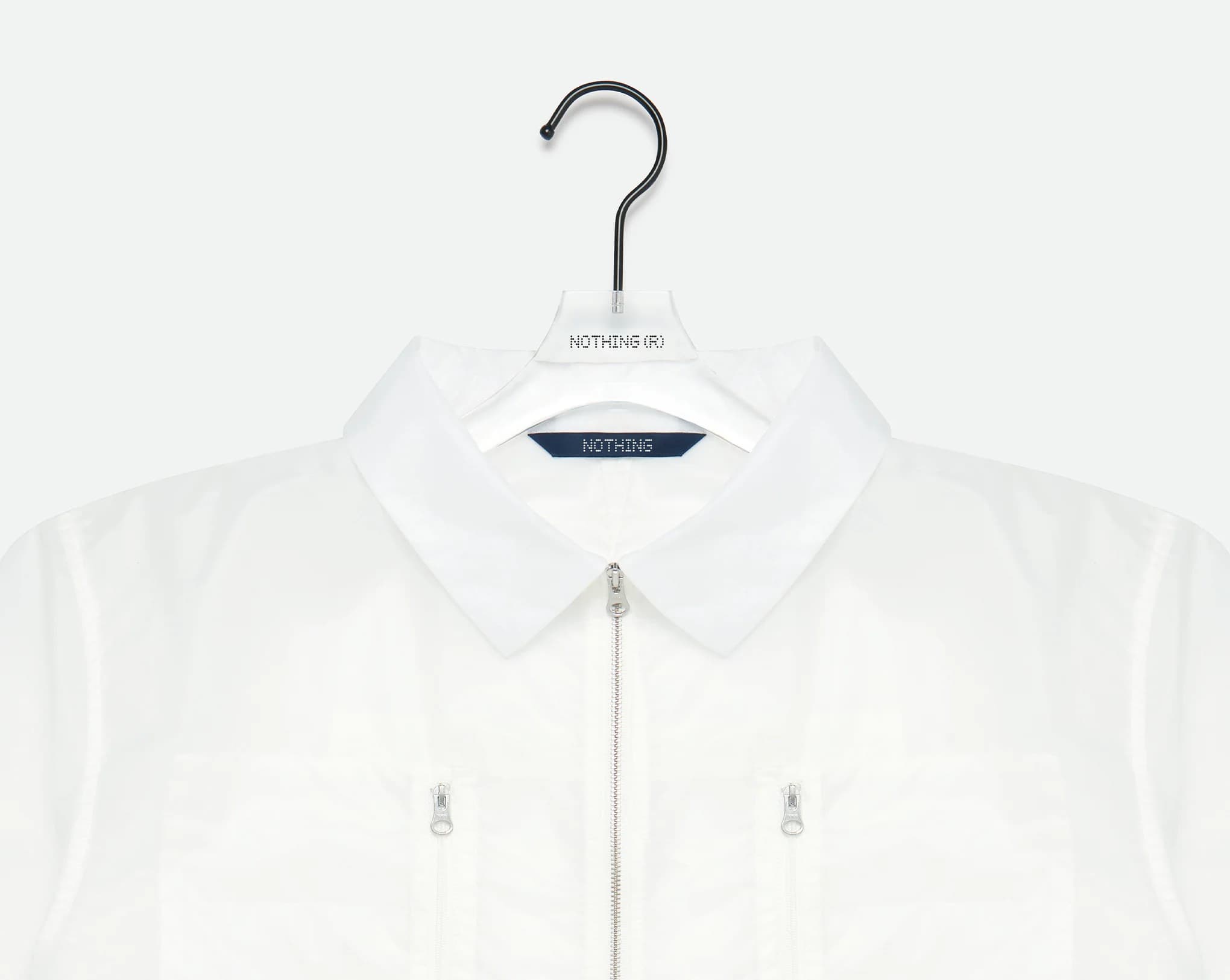 Подробностей пока нет, так как анонс предварительный. И даже неясно до конца, что именно это за одежда, так как фотография показывает лишь верхнюю часть. Мы можем оценить лишь белый цвет, минималистичное исполнение, воротник, как у рубашки, и застёжку-молнию.