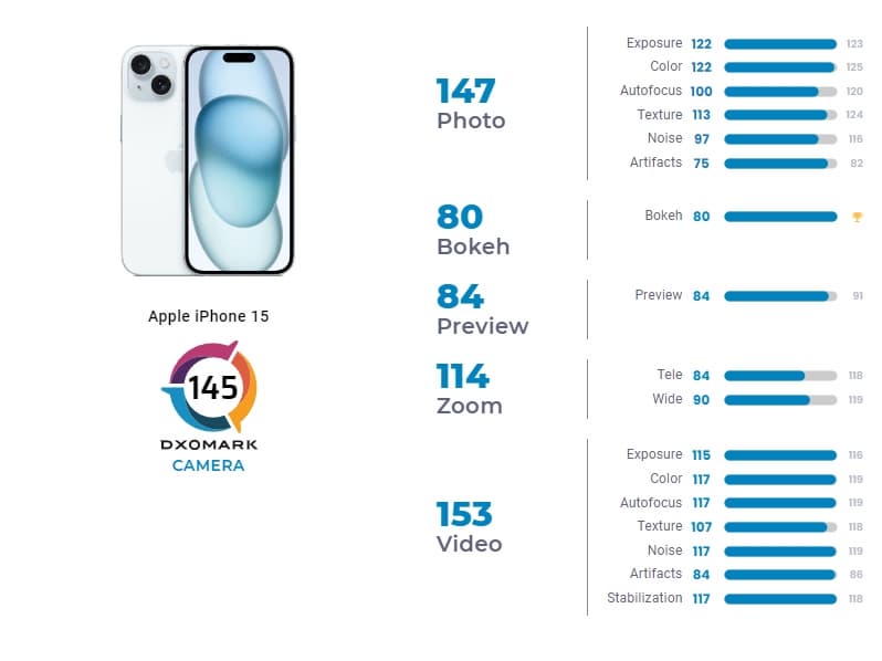 Также можно отметить, то iPhone 14 год назад получил 133 балла, так что улучшение заметно. Если же рассматривать результат подробнее, стоит отметить рекордные 80 баллов за размытие заднего фона. А худший показатель у новинки ожидаемо за возможности зума.