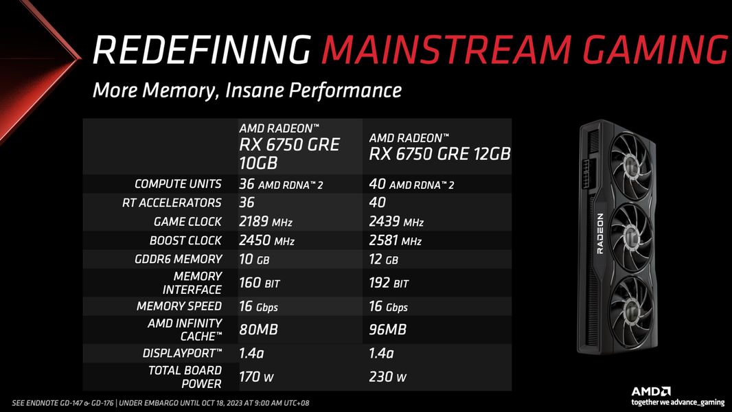 Версия Radeon RX 6750 GRE с 12 ГБ памяти GDDR6 получила GPU с 40 вычислительными блоками и частотой 2439–2581 МГц. Ширина шины памяти составила 192 разряда, объём Infinity Cache — 96 МБ, а потребление куда выше — 230 Вт.