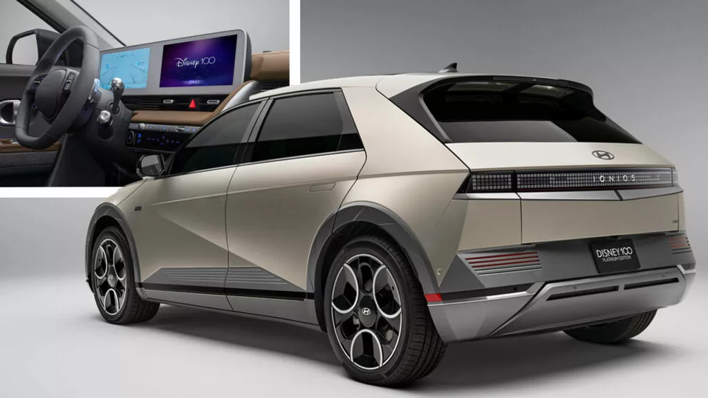 Hyundai представила концепт Ioniq 5 Disney100 Platinum на автосалоне в Нью-Йорке в начале этого года. Специальное издание сохранило кузов Gravity Gold Matte с колёсными дисками, узор на которых навевает ассоциации с ушами Микки Мауса.