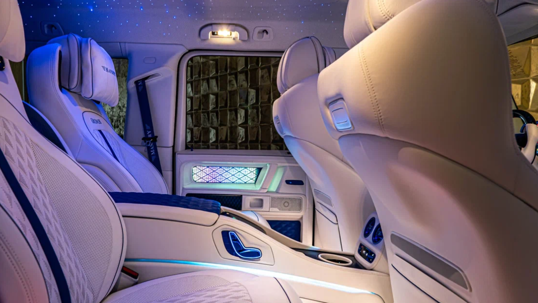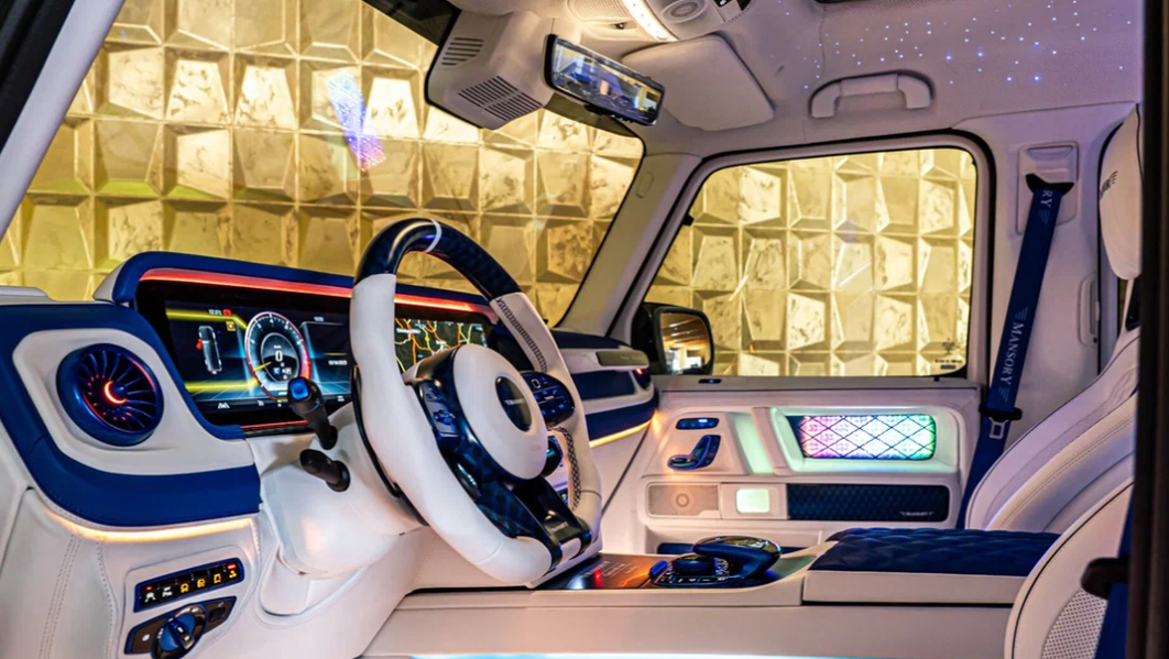 Салон внедорожника полностью обит белой и синей кожей, а также украшен карбоновыми накладками и новой системой подсветки. В задней части салона установлены два кресла, разделённые массивной консолью.