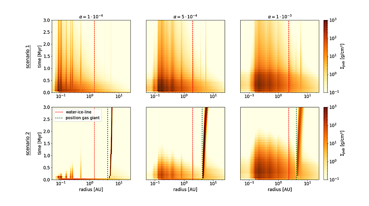 В сценарии с газовым гигантом видно скопление заблокированных строительных элементов за пределами положения газового гиганта. Дальнейшие скопления внутри линии водяного льда возникают в результате переконденсации и мигрирующего наружу газа в разных областях испарения.