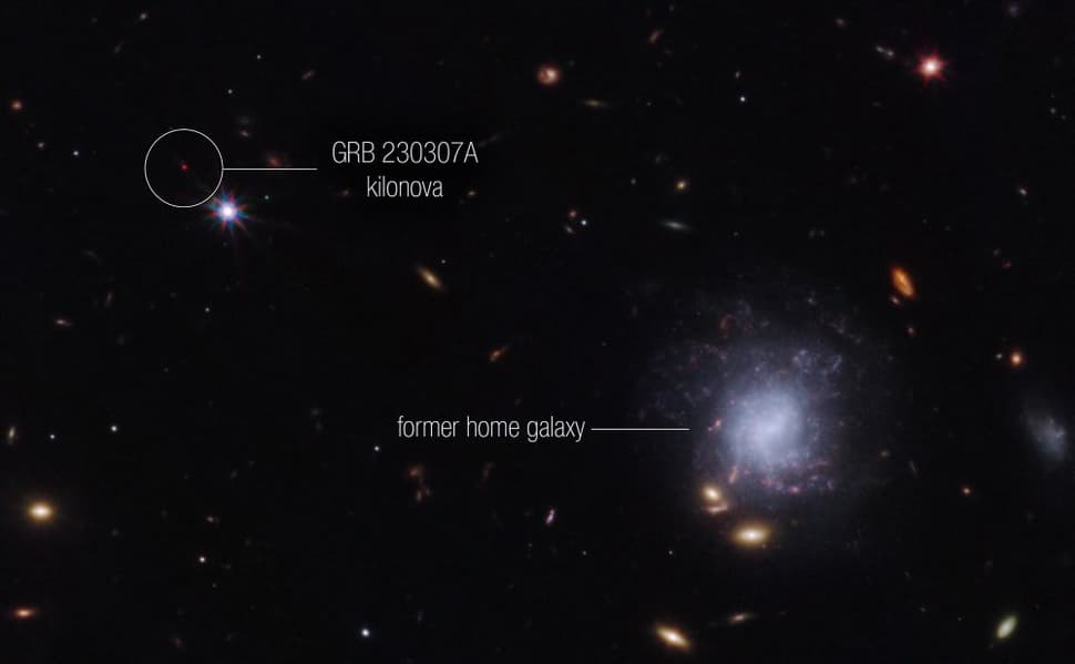 Последние наблюдения JWST и наземных телескопов подтвердили наличие тяжёлых элементов в выбросах материала гамма-вспышки GRB 230307A.