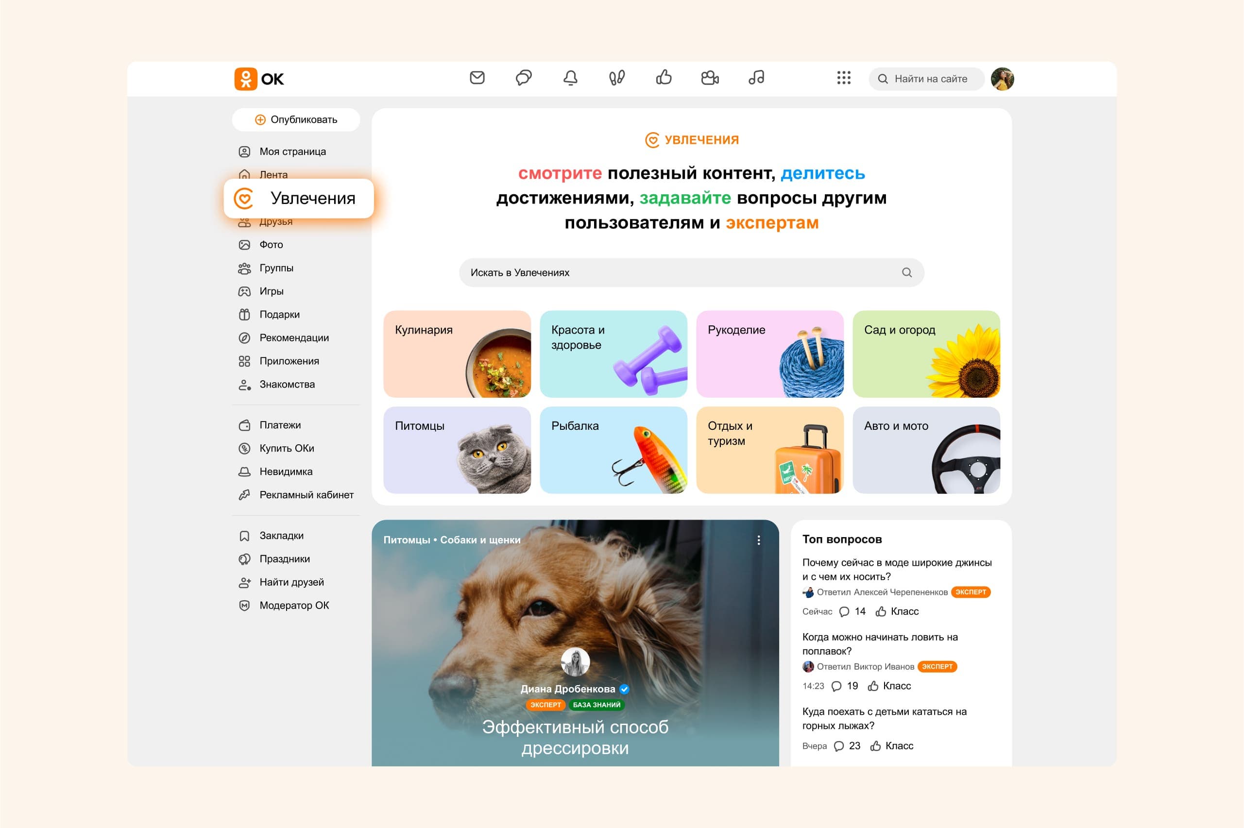 Команда «Одноклассников» объявила о запуске большого обновления раздела «Увлечения». Пользователи могут не только находить в «Увлечениях» контент по своим хобби, но и делиться публикациями с другими, задавать вопросы экспертам и обсуждать любимые занятия с единомышленниками. В сервисе появились новые разделы – «Вопросы и ответы» и «База знаний».