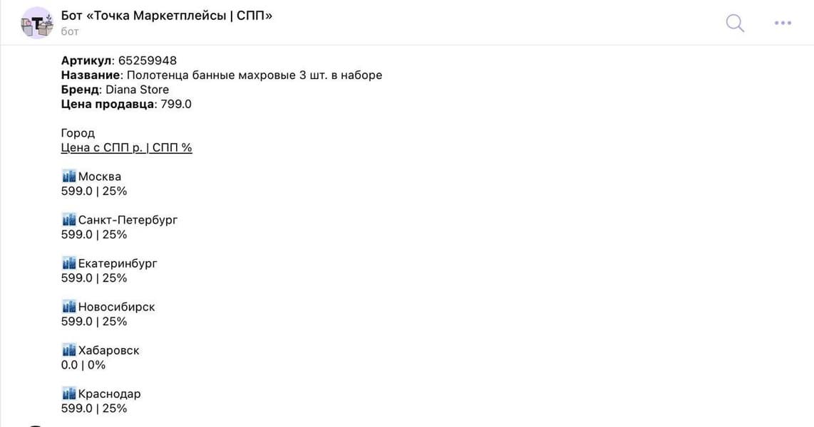 Таким образом, бот значительно упростит продавцам поиск наибольшей скидки по своим товарам, требуется ввести только артикул в строку сообщения. Селлер, проанализировав, где его товар продаётся по самым выгодным условиям, может отгрузить туда больше продукции, чтобы не оказаться в ситуации, когда спрос есть, а предложения — нет. Особенно актуально в преддверии Чёрной пятницы и 11.11.