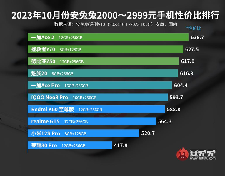 В категории от 2000 до 2999 юаней (от 274 до 409 долларов) первое место занимает OnePlus Ace 2, второе – Lenovo Legion Y70, а третье — Nubia Z50 на основе Qualcomm Snapdragon 8 Gen2.