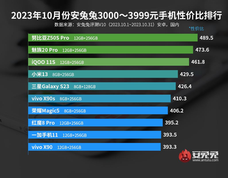В следующей ценовой категории, от 3000 до 3999 юаней (от 410 до 546 долларов), первые три места принадлежат Nubia Z50S Pro, Meizu 20 Pro и iQOO 11S.