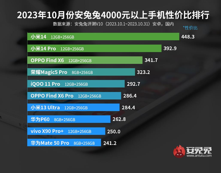 В категории от 4000 юаней (от 547 долларов) на первое место сразу прорвался новейший флагман Xiaomi 14 на основе Qualcomm Snapdragon 8 Gen3, второе место занял Xiaomi 14 Pro, а третье досталось Oppo Find X6.