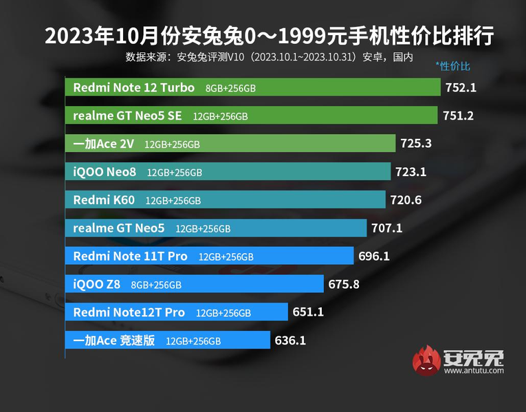 В самой дешёвой категории до 1999 юаней (до 273 долларов) первое место продолжает занимать Redmi Note 12 Turbo, а вот второе и третье места теперь достались Realme GT Neo5 SE и OnePlus Ace 2V.