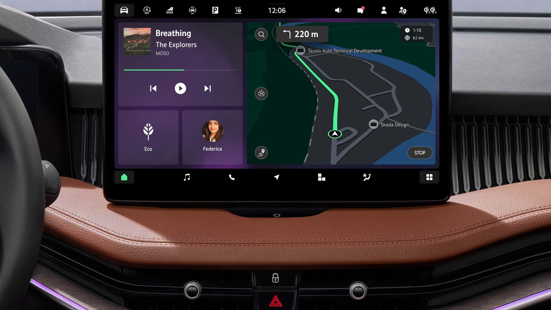 Интерьер преобразился: цифровая приборная панель «нарисована» на 10-дюймовом экране, диагональ экрана медиасистемы составляет 13 дюймов, есть проекционный дисплей нового поколения. По сути, по всем этим экранам Superb унифицирован с Kodiaq. И точно так же, как в Kodiaq, на передней панели появился круглый многофункциональный регулятор. С его помощью можно изменять громкость медиасистемы и параметры климатической системы, менять режимы вождения и даже масштабировать навигационную карту.