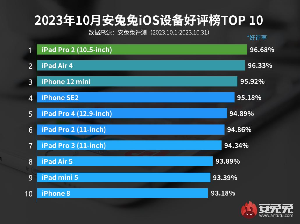 Первое место принадлежит 10,5-дюймовому iPad Pro 2 с 96,68% положительных отзывов. На втором месте расположился планшет iPad Air 4 (96,33%), дебютировавший в сентябре 2020 года. Третье место принадлежит компактному iPhone 12 mini с 95,92%, дебютировавшему в также в 2020 году.