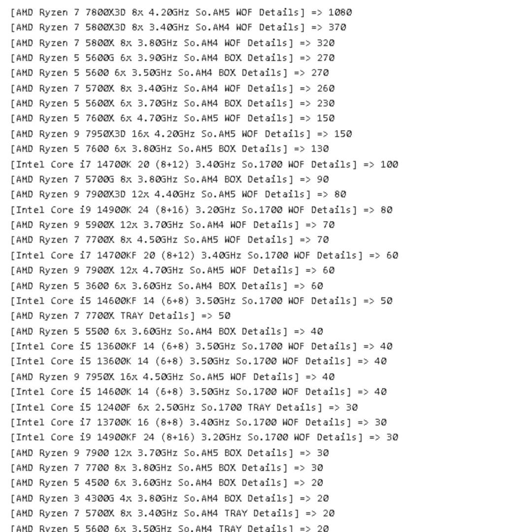 Лучший из синих – Core i7-14700K на 11 позиции, но за неделю таких процессоров было продано всего 100 штук. Для сравнения, Ryzen 7 7800X3D было продано почти в 11 раз больше! Вообще Ryzen 7 7800X3D – это суперхит: Mindfactory продала этих процессоров в три раза больше, чем всех представителей линейки Core 14 вместе взятых.