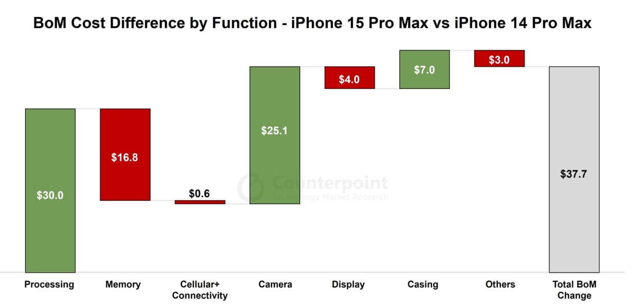 Аналитики Counterpoint Research подсчитали стоимость комплектующих iPhone 15 Pro Max и выяснили, что в сравнении с предшественником, iPhone 14 Pro Max, компоненты для смартфона обходятся Apple на 37,7 долларов дороже. Казалось, что столь солидная прибавка обеспечена в основном титановой рамкой корпуса, но нет: на ее долю приходится лишь 18% удорожания.