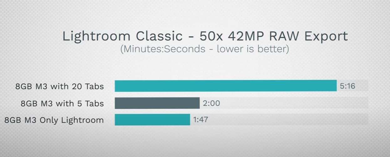 В Lightroom разница уже практически двукратна: 1 минута 6 секунд с 16 ГБ памяти и 1 минута 47 секунд – с 8 ГБ. Более того, если дополнительно с Lightroom открыть браузер всего с пятью вкладками, то младший ПК начинает работать медленнее и справляется с задачей уже за 2 минуты. Если же открыть 20 вкладок, то младшая модель обрабатывает тот же проект уже более чем за 5 минут! 16-гигабайтная версия никаких просадок при этом не испытывает.