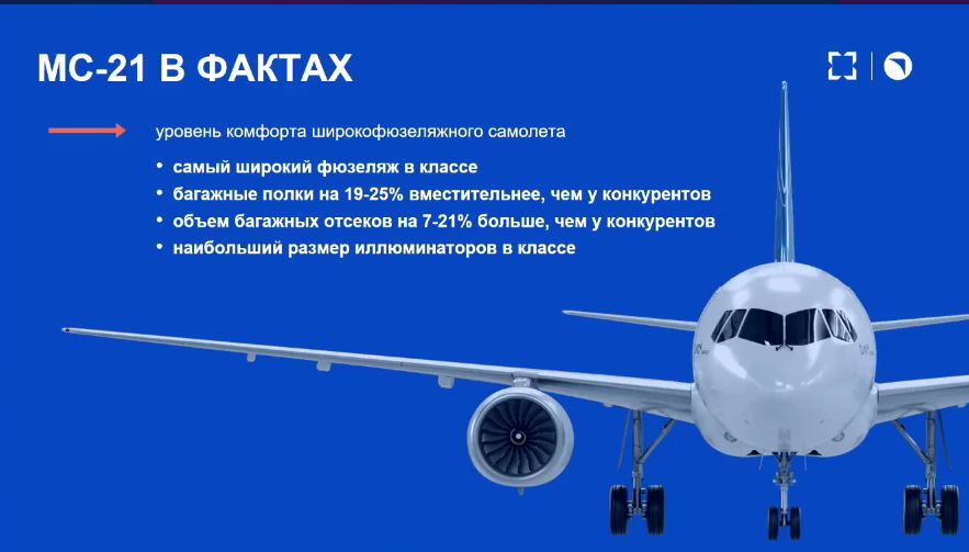 Создатели МС-21 называют его самым комфортным в своём классе и первым в мире узкофюзеляжным среднемагистральным лайнером с композитным крылом