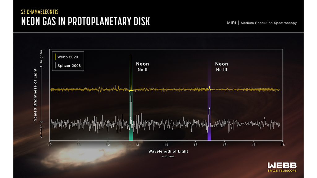 В наблюдениях, проведённых командой под руководством Кэтрин Эспайят в 2008 году с использованием телескопа NASA Spitzer, была замечена инфракрасная спектральная линия, связанная с дважды ионизированным неоном ([Ne III]). Сигнал исходил из газово-пылевого диска вокруг молодой звезды SZ Chamaeleontis (SZ Cha).