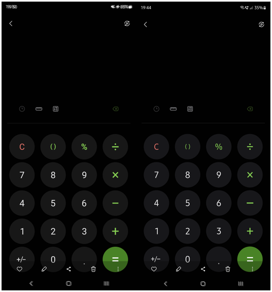 На скриншоте слева — Galaxy Note 20 Ultra с One UI 5.0. Как видно по строке состояния, элементы как бы смазаны на несколько пикселей, свидетельство корректной работы Pixel Shift. На скриншоте справа — Galaxy S23 Ultra с UI 6.0, сдвига здесь не наблюдается.