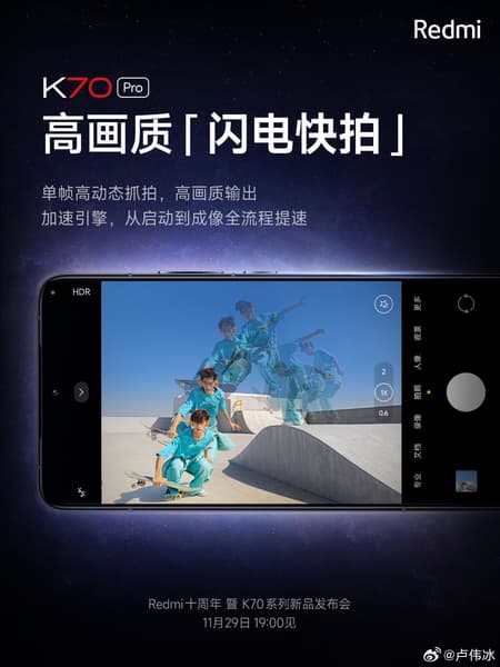 Смартфон Redmi K70 Pro будет поддерживать технологию высокоскоростной съёмки Lightning Snapshot, которая позволит делать чёткие фото движущихся быстро людей, животных и других объектов.