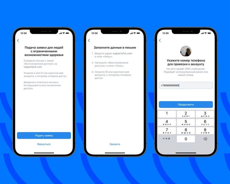 Кроме того, незрячие пользователи смогут восстановить профиль VK ID с помощью фото через электронную почту, сделать это можно по специальной кнопке на экране восстановления доступа, которая будет озвучена. Доступно и восстановление с помощью друзей: голосовой помощник зачитает имя и фамилию друга, указанного в модальном окне. Коды, которые друзья сообщат пользователю, тоже будут озвучены голосовым помощником, а на экране ввода номера телефона при восстановлении пароля VK ID вместо буквенной будет сразу открываться цифровая клавиатура.