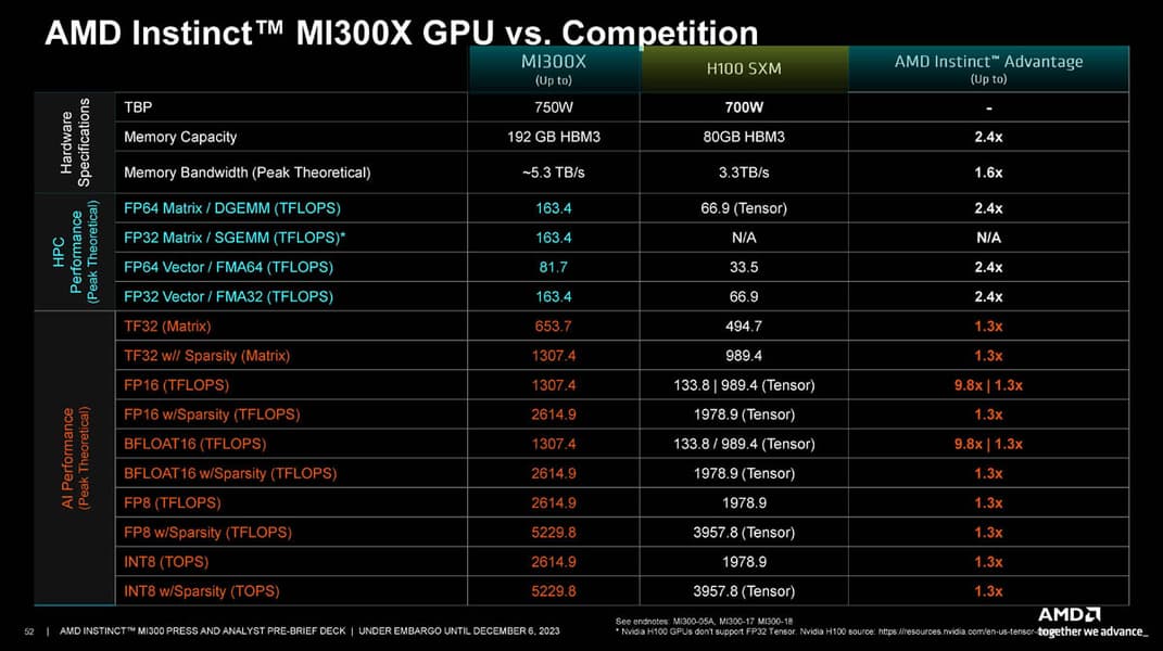 Instinct MI300X состоит из 153 млрд транзисторов, что делает его самым большим и сложным GPU в мире. Графическое ядро имеет 304 блока CU, то есть 19 546 потоковых процессоров, и 1216 ядер Matrix Core. Ускоритель также обладает огромным объёмом очень быстрой памяти. Это 192 ГБ HBM3 с пропускной способностью 5,3 ТБ/с. Для сравнения, у Nvidia H100 имеется до 80 ГБ памяти с пропускной способностью 3,35 ТБ/с.