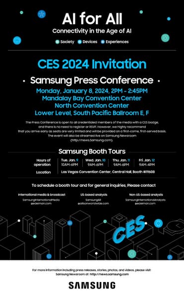Samsung опубликовала приглашение на мероприятие, которое состоится в США 8 января, за день до официального открытия выставки CES 2024. Анонс озаглавлен «ИИ для всех», речь на мероприятии пойдёт об искусственном интеллекте реализованном, в частности, в смартфонах линейки Galaxy S24.