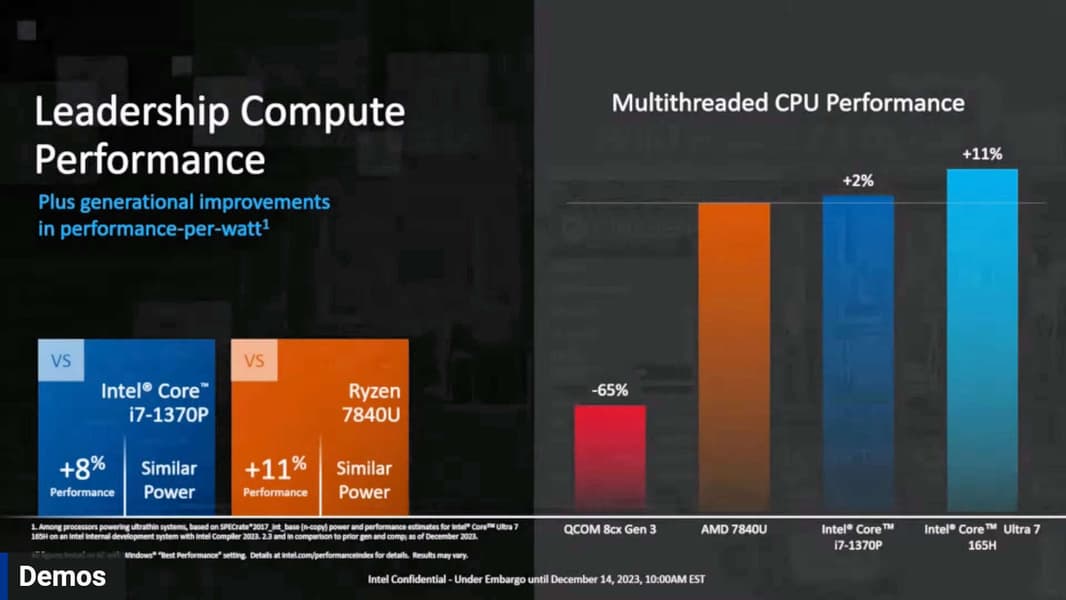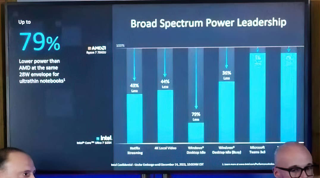 Наверное, самый интересный слайд посвящён энергопотреблению. Intel обещает какие невероятные успехи в этом направлении, указывая, что Core Ultra 7 165H в реальности будет потреблять вплоть до 79% меньше энергии, чем Ryzen 7 7840U при одинаковом TDP. Конечно, речь о максимальной разнице, но на слайде видно, что во многих сценариях она также огромна и составляет 35–45%.