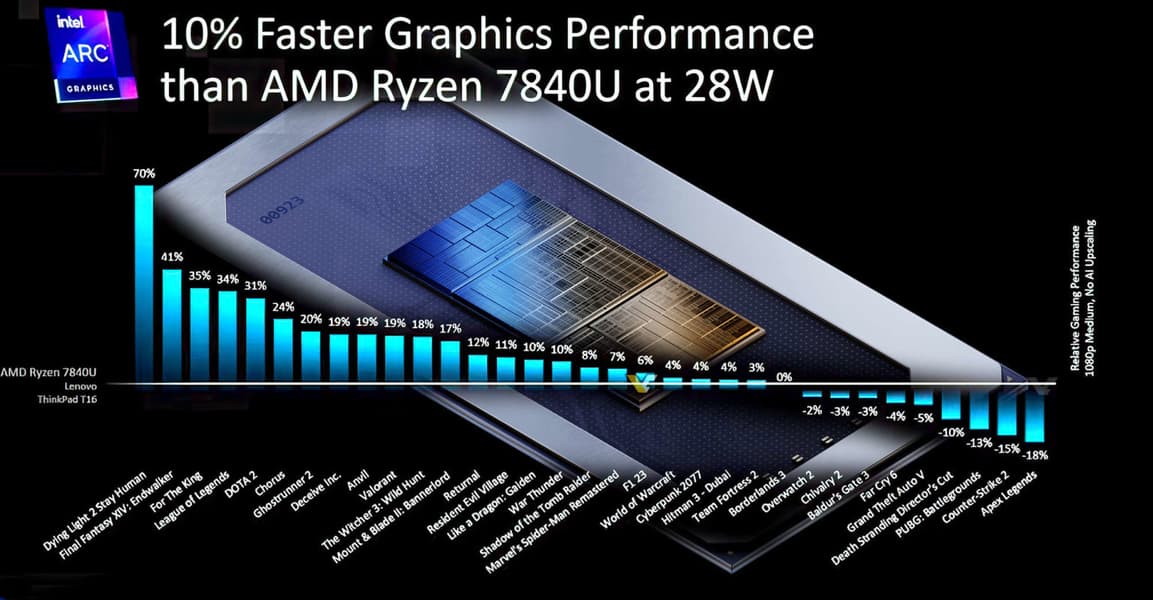 На них Intel сравнивает свой новый CPU Core Ultra 7 165H с Ryzen 7 7840U в 28-ваттном режиме. Если точнее, она сравнивает iGPU.