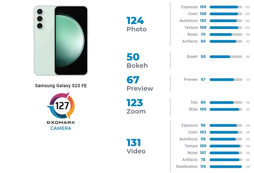 Камеру оценили весьма неплохо. Общий результат составил 127 баллов, что на 10 баллов выше, чем у Galaxy S21 FE. 127 баллов — это уровень примерно как у Google Pixel 6, Galaxy Z Flip5, iPhone 12 Pro и ряда других смартфонов. То есть это весьма достойно по сегодняшним меркам, хотя и далековато от лидеров. Более того, в классе High-End, который выделяет источник, Galaxy S23 FE и вовсе занимает третье место после Pixel 7 и 7a.