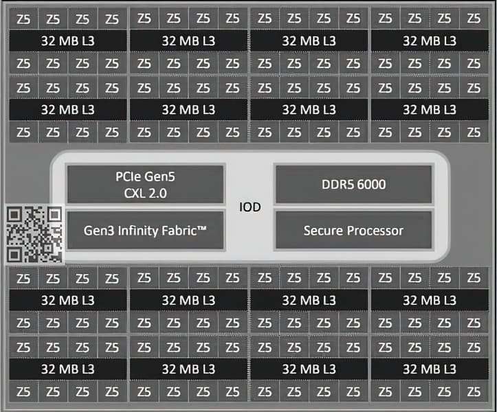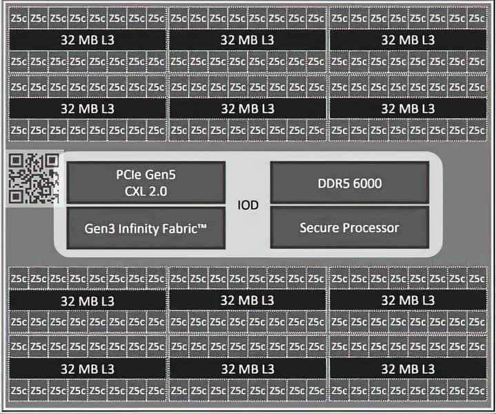 Модели Turin Classic будут иметь до 16 процессорных чиплетов по 8 ядер в каждом. Каждый чиплет будет иметь 32 МБ кеш-памяти третьего уровня, что суммарно даст 512 МБ кеш-памяти, и это без 3D V-Cache! У Turin Dense будет до 12 чиплетов по 16 ядер и 32 МБ кеш-памяти в каждом, то есть суммарно кеша L3 будет до 384 МБ.