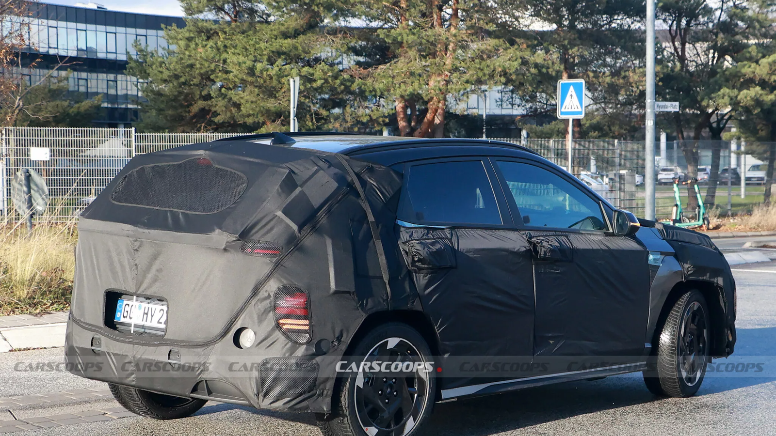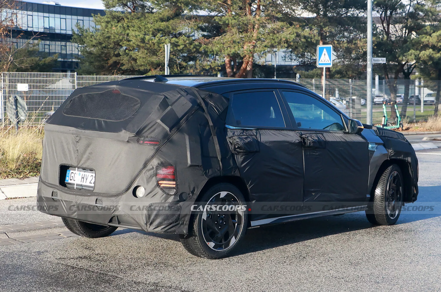 Примечательно, что прототип, похоже, не имеет обвеса Kona N Line 2024 года. Вместо этого и передний, и задний бамперы очень напоминают бамперы стандартного Kona Electric, а характерное большое заднее антикрыло и двойные выхлопные трубы отсутствуют, что логично для электромобиля. Более спортивную версию выдают новые легкосплавные диски, более заметные боковые юбки, задний диффузор и скрытые значки на передних крыльях.