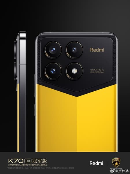 Redmi K70 Pro Champion Edition доступен в зелёном и жёлтом цветах, декорированная камера получила текстуру из углеродного волокна. Эта версия также отличается упаковкой и аксессуарами. Дизайн смартфона вдохновлён трековым суперкаром Lamborghini Essenza SCV12.