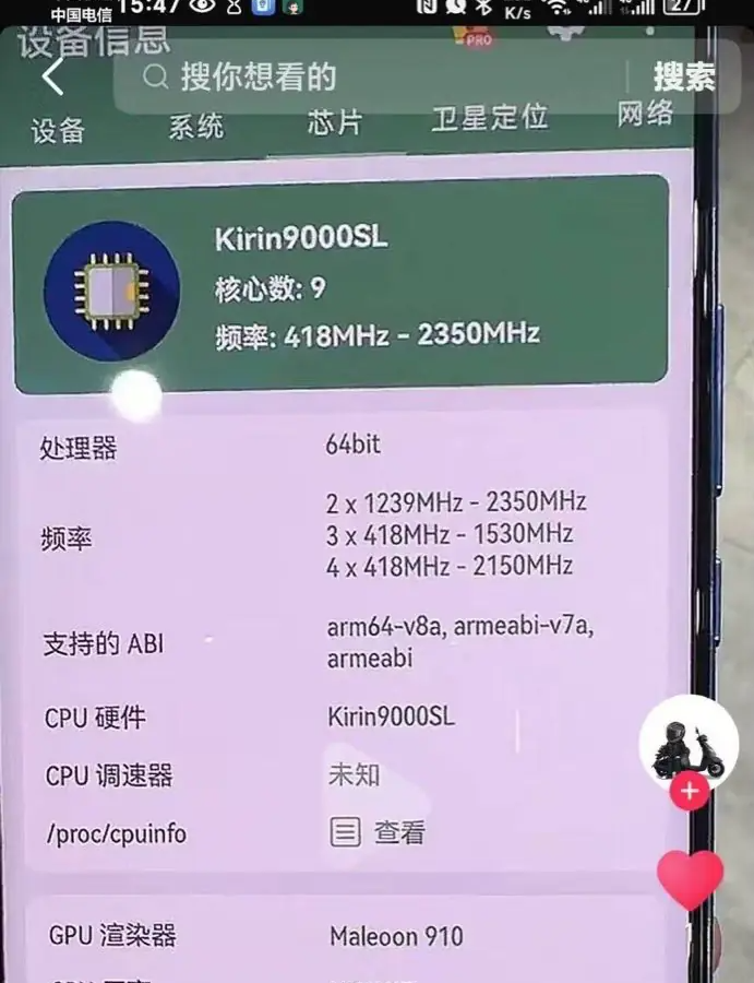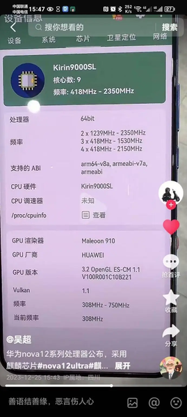 Издание IT Home опубликовало скриншот, который подтверждает, что в состав Kirin 9000SL войдут два ядра с частотой 2,35 ГГц, четыре ядра, работающих на частоте 2,15 ГГц, и три ядра, которые работают с частотой 1,53 ГГц. В качестве графического процессора используется Maleoon 910.