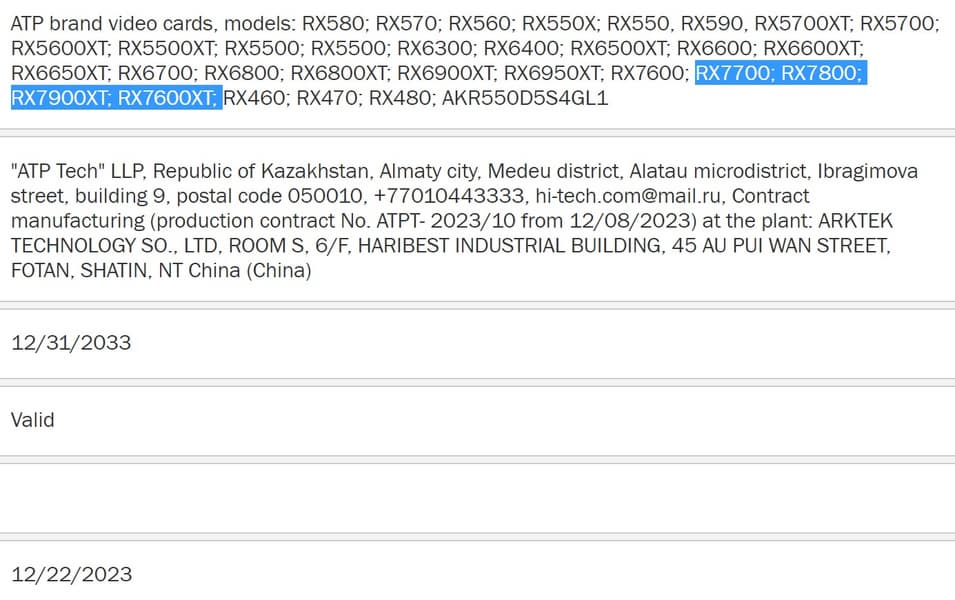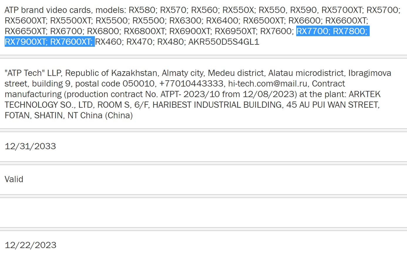 Речь об адаптерах Radeon RX 7600 XT, RX 7700 и RX 7800. Их в базу внесла китайская компания Arktek. Сразу стоит оговорить, что регистрация каких-то моделей в EEC не означает, что эти модели обязательно выйдут. Производители могут заранее регистрировать какие-то названия, которые, как они считают, могут появиться на рынке.