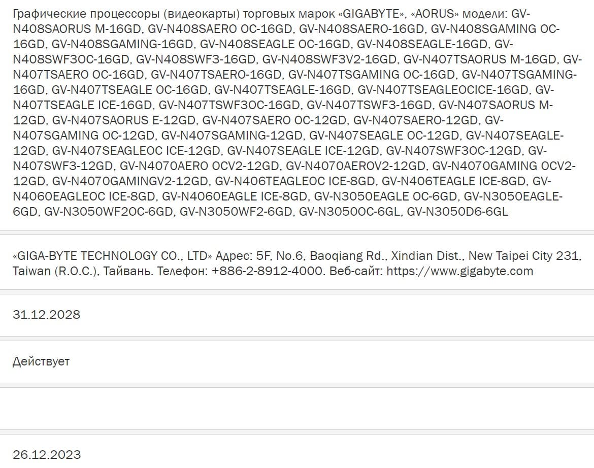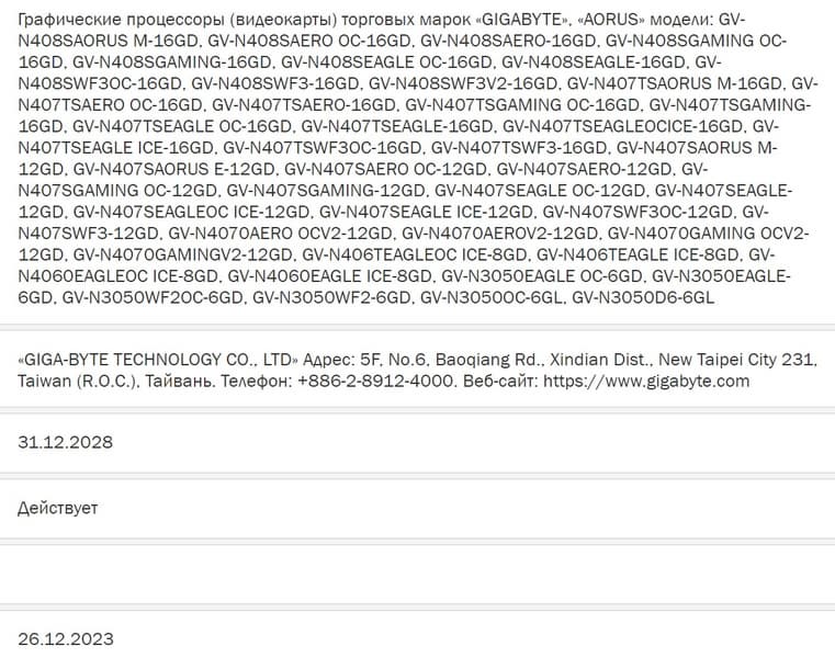 Регистрация Gigabyte в базе EEC подтверждает информацию об объёме памяти у видеокарт GeForce RTX 40 Super.