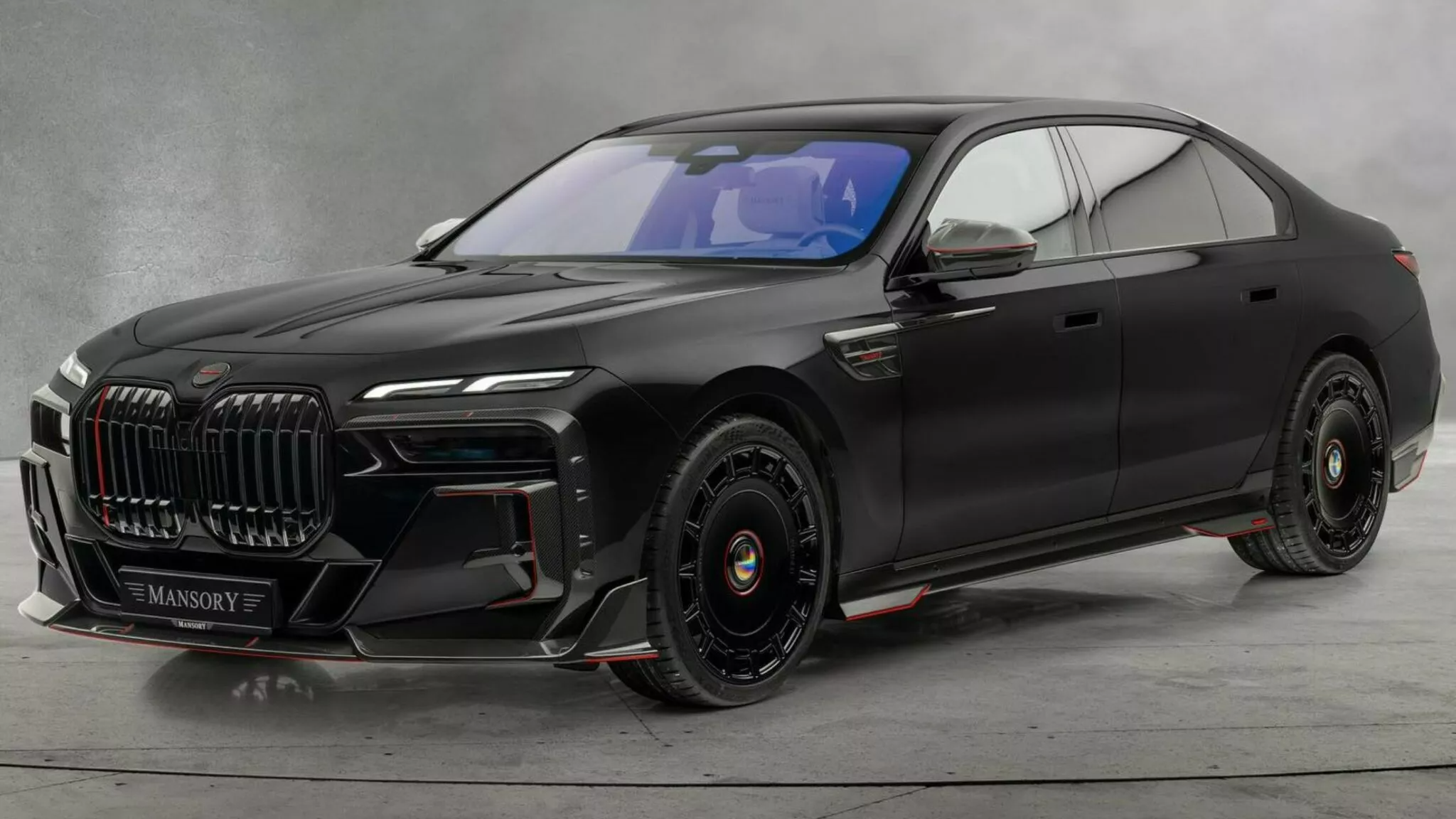 BMW 7-Series G70 от Mansory оснащен коваными колесами FD.15 диаметром 22 дюйма с дизайном, вдохновленным Rolls-Royce. На фото показали брендинг Mansory на боковых порогах из углеродного волокна и ковриках. По словам тюнера, по запросу возможна индивидуальная обработка салона.