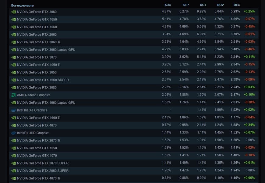 Как всегда, нас интересуют в первую очередь видеокарты. Тут без особых изменений. Лидером остаётся RTX 3060 даже без учёта мобильной версии. Карта установлена у 5,29% всех пользователей Steam и за месяц набрала 0,25 процентного пункта.
