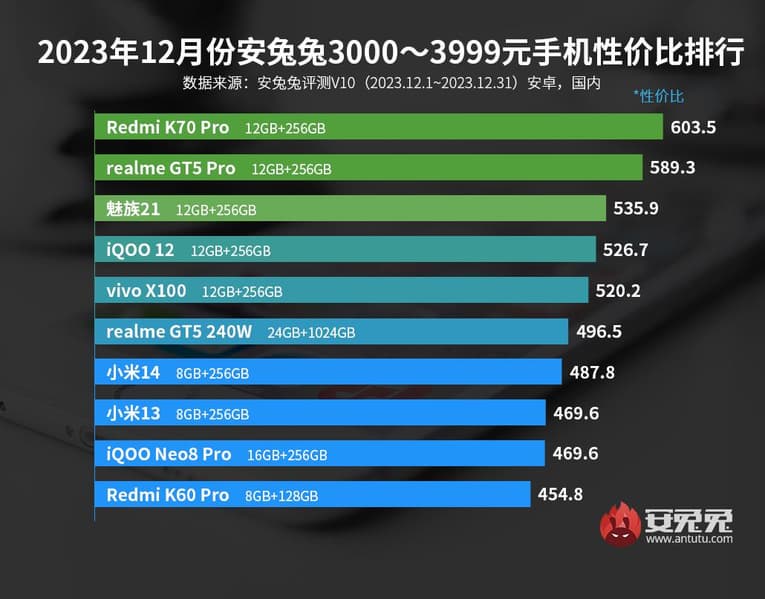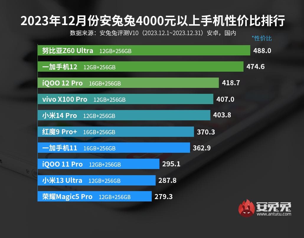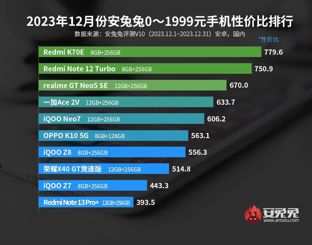 AnTuTu продолжает публиковать рейтинги за декабрь 2023 года. Ранее были названы самые мощные флагманы и субфлагманы, а сейчас представлены рейтинги лучших Android-смартфонов по соотношению цены и производительности.