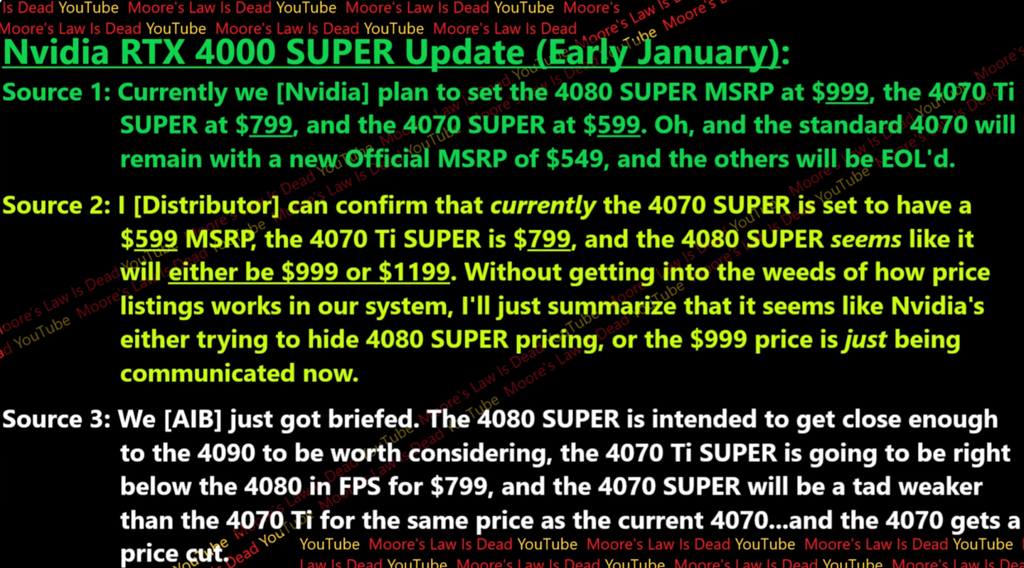 Официальная премьера новых видеокарт Nvidia линейки GeForce RTX 40 Super состоится в начале следующей недели, но инсайдер Moore's Law is Dead уже назвал цены. Данные получены от трех источников, среди которых дистрибутор и производитель видеокарт.