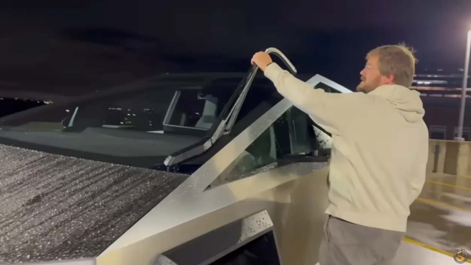 В отличие от традиционных дворников, которые очень жесткие, стеклоочиститель Cybertruck кажется очень мягким. На видео Кайл Коннер легко оторвал дворник от лобового стекла, после чего стеклоочиститель повис, как «гигантская мокрая лапша», со слов самого обозревателя.