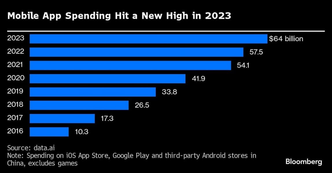 Всего же по итогам 2023 года траты пользователей в приложениях (без учёта игр) составили 64 млрд долларов против 57,5 млрд в 2022 году. То есть на TikTok пришлось более 15% всей суммы. Что интересно, отчёт говорит, что траты пользователей в приложениях превысили траты в играх.