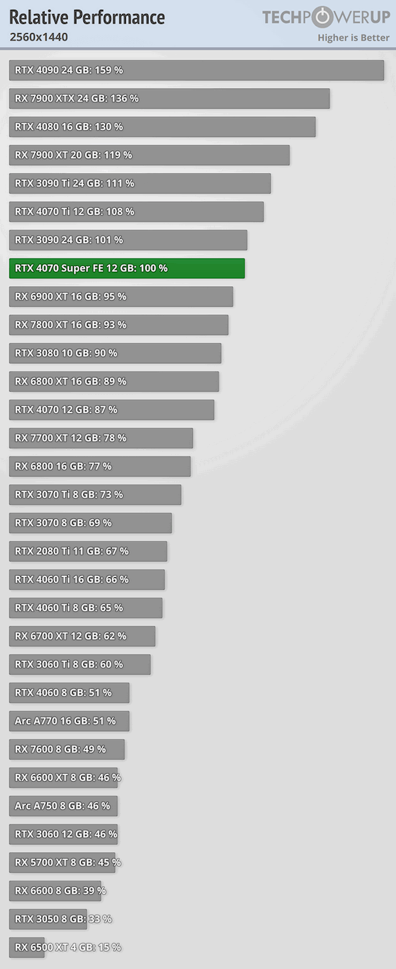 Итак, за основу мы возьмём обзор TechPowerUp, как один из самых объёмных и всесторонних. Согласно тестам наших коллег, RTX 4070 Super опережает RTX 4070 на 14–15% в зависимости от разрешения. В свою очередь RTX 4070 Ti быстрее новой карты на 6–8%, то есть достаточно незначительно, а в случае разогнанных моделей Super разница будет ещё ниже.