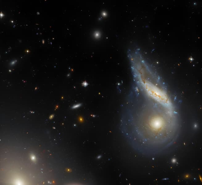 Новое изображение, полученное космическим телескопом «Хаббл», представляет собой захватывающий снимок галактического столкновения, иллюстрирующий динамический процесс слияния двух галактик. На первый взгляд, кажется, что это одна галактика, но на самом деле это две различные галактики — NGC 6040 и LEDA 59642, столкнувшиеся в спиральном «танце». Объект находится на безопасном расстоянии около 570 миллионов световых лет от Земли.